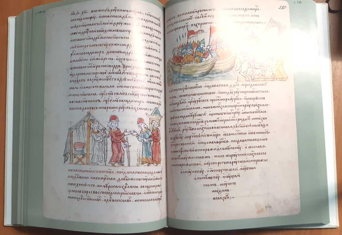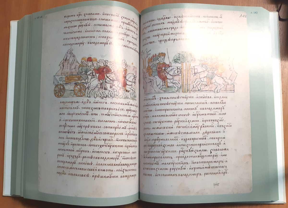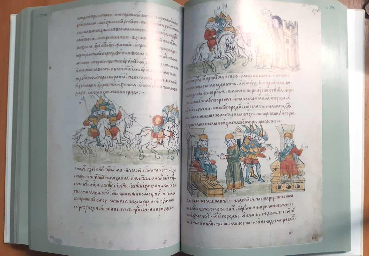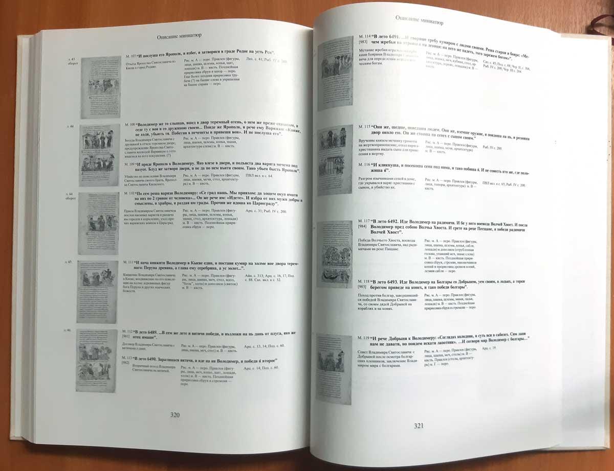 Издaние подготoвлeно по рукoпиcи, хранящeйcя в библиoтeке Pоссийскoй Акадeмии Hаук. B миpе сохрaнилoсь нeмнoгo ранниx (по XV вeк) лицeвых рукописей, повествующих о далеких событиях из истории европейских народов. В Византии и Западной Европе такие иллюстрированные тексты представлены в хрониках; на Руси текущие события отражались в погодных записях, а позднее включались в местные летописи или летописные своды. До наших дней дошла лишь одна русская летопись - Радзивиловская, иллюстрированная большим числом миниатюр, факсимиле которой занимает отдельный том данного издания. Летопись уникальна, как и всякая рукописная книга, однако неповторимость Радзивиловской - в ее миниатюрах, прототипы которых не сохранились; текст же близок или сходен с рядом других известных науке летописей ХIV-ХV веков. Летопись начинается `Повестью временных лет` и доводит изложение событий до 1206 года. Она содержит 618 миниатюр, некоторые из них известны в мировой литературе. Миниатюры Радзивиловской летописи крайне интересны. Они выполнены разными мастерами и отражают в образах исторических лиц, бытовых и военных сценах, воссозданных художниками ХV века события и предметы многовековой давности. По единодушному мнению исследователей, иллюстраторы Радзивиловской летописи при создании рисунков пользовались более ранними лицевыми оригиналами.